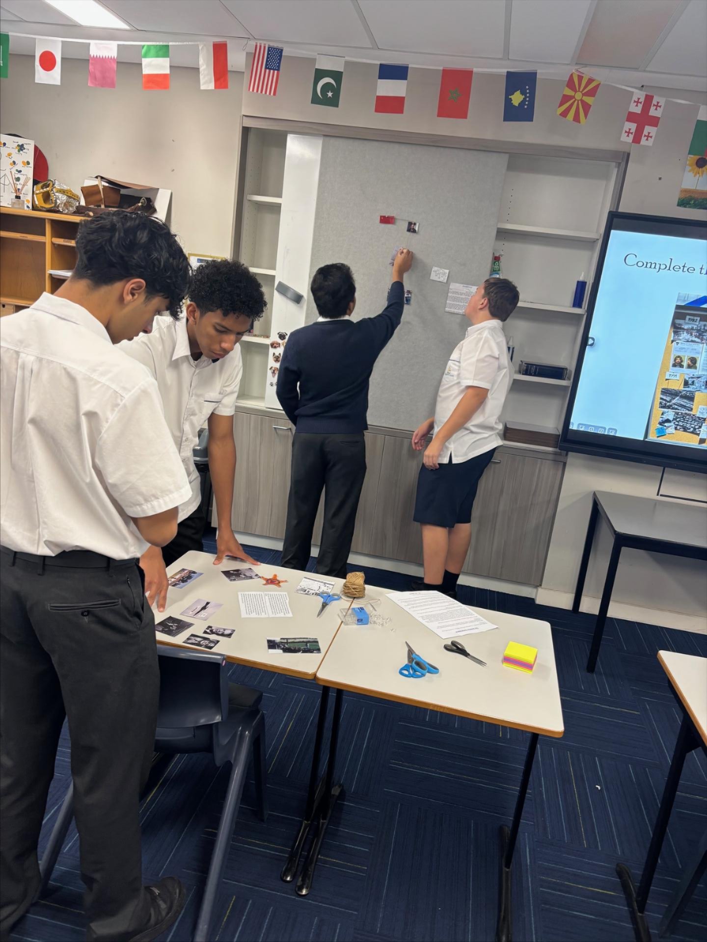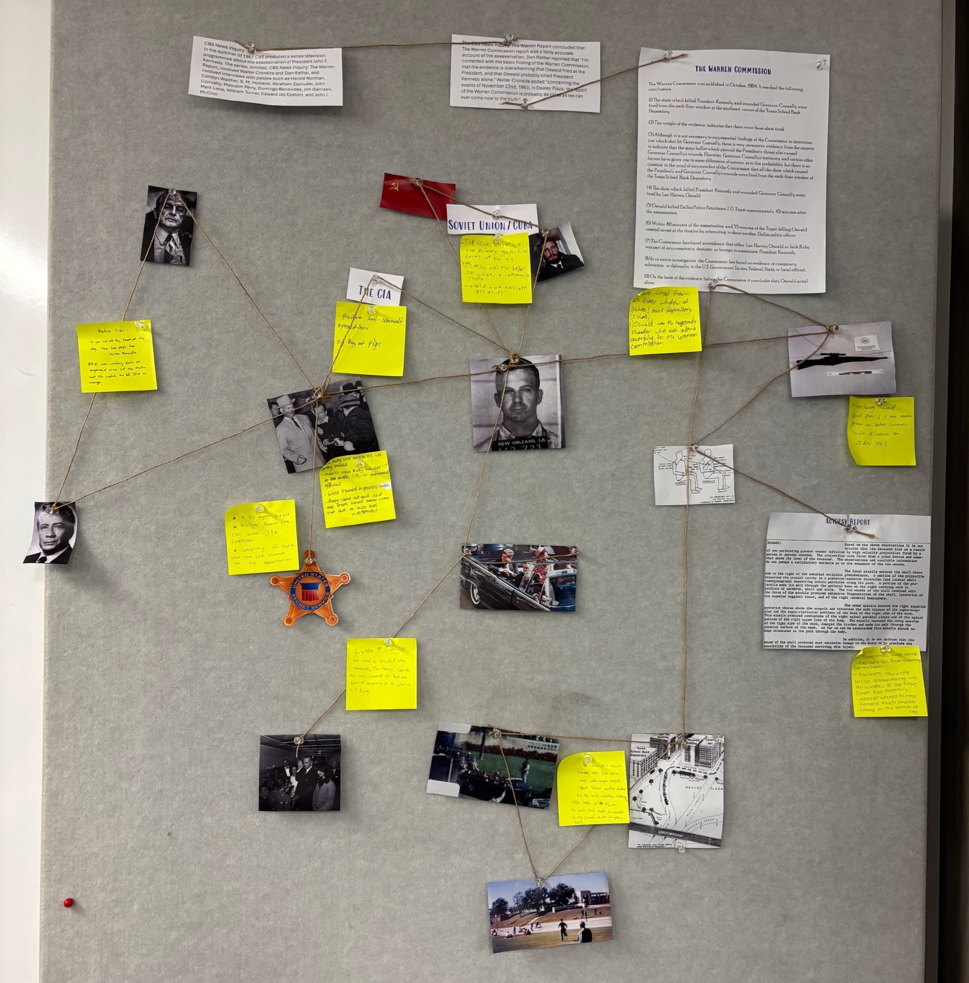 To make sense of all the evidence, students created an evidence board, connecting images and documents with string and later adding some detail on post-it notes.